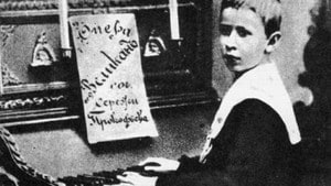 Noen over gjennomsnittet flinke barn. Her er et bilde av den ni år gamle Prokofjev med notene til hans første opera, Kjempen. Han var kanskje ikke blant de aller mest geniale vidunderbarn, men ambisiøs nok. Vi hører også musikk av to av de aller beste: Mendelssohn og Korngold.